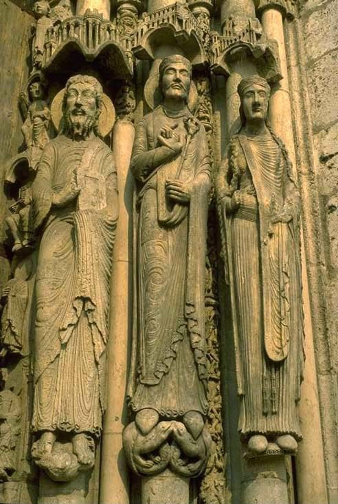 The next major difference is in the style and amount of artwork. In general, the Romanesque style is extremely organized, diagrammatic, and stylized. It tends to take cues from Byzantine art, in which the figures' relative size to another figure is based upon its' importance in the spiritual hierarchy. For example, when Jesus or an Angel is shown, they are relatively larger than all the other figures whom are depicted in a particular scene. This shows how important they are, they loom above the mere mortals, faithful and sinners alike. In contrast, the Gothic style of sculpture and art within a cathedral is very much a "schema and correction" of the Romanesque art. While the same themes and saints may be depicted, they are far more naturalistic, shown more or less in proportion often with detailed, flowing robes which harken back to the Greek ideals of art and beauty. For example, in Stokstad on pg. 594, is a depiction of Dormition of the Virgin from the Strasbourg cathedral in France. Jesus, the virgin, and all the followers are all equal in size and proportion, the only thing that shows Jesus as the most important figure is his place n the center and his halo, otherwise he blends in with the others. There also tends to be more of an emphasis on the stories of Jesus in the Gothic cathedrals, whereas the Romanesque cathedrals tended to emphasize not only Jesus, but biblical stories, morality stories, saints, parables, and virtues. Context: The realism of her pose and drapery demonstrate the beginnings of the heightened realism that occurs during this period. These classical references are both "classy" but also refer to the new ideas concerning a more humanistic approach towards interpreting scripture. The naturalism relates more towards the viewer than ever before and it is possible to imagine the scene as something real.